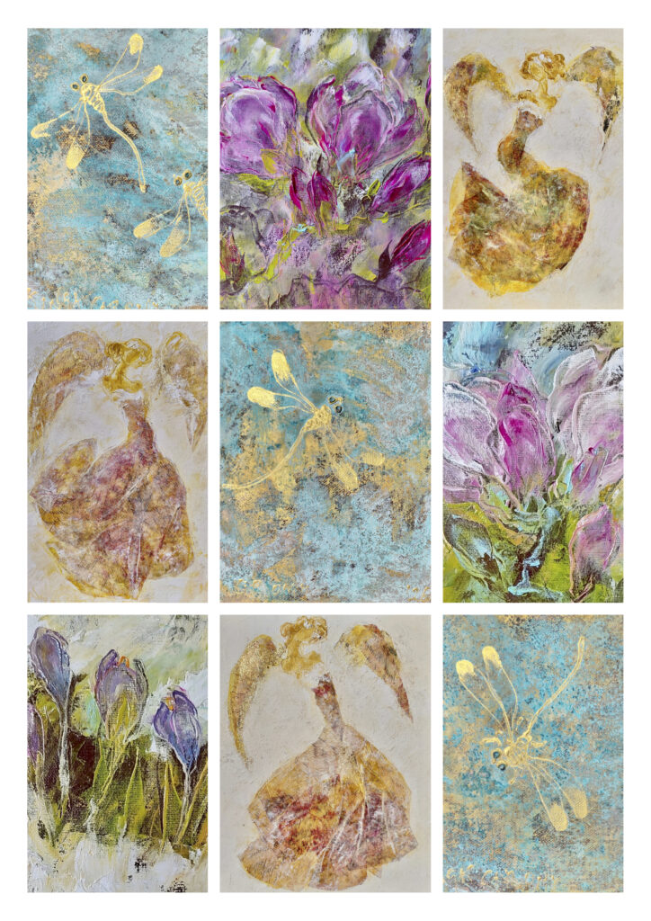 W swojej twórczości inspiruje się często naturą. Maluje kwiaty, pejzaże ,ważki i anioły.