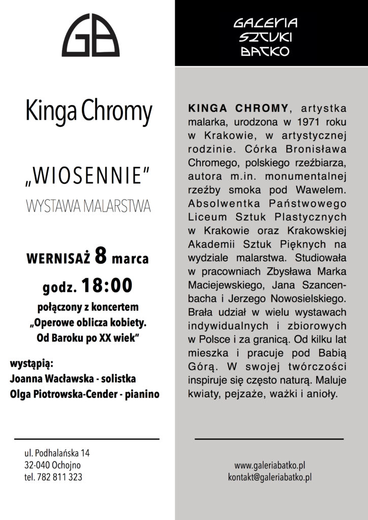 Tradycyjnie, bo już od 15 lat; 8 marca odbywa się w Galerii wernisaż wystawy malarstwa połączony z koncertem. W tym roku artystką prezentującą swoją twórczość będzie Kinga Chromy wraz z córką Kają Dutkiewicz. Zapraszam, (koncert godzina 18.00, wernisaż po koncercie ,bilety do nabycia przed koncertem w cenie 30 zł.)